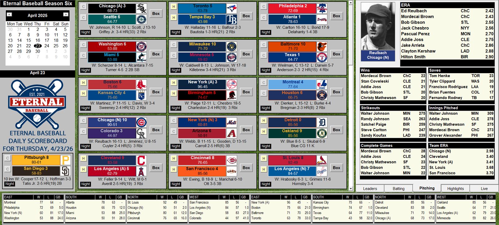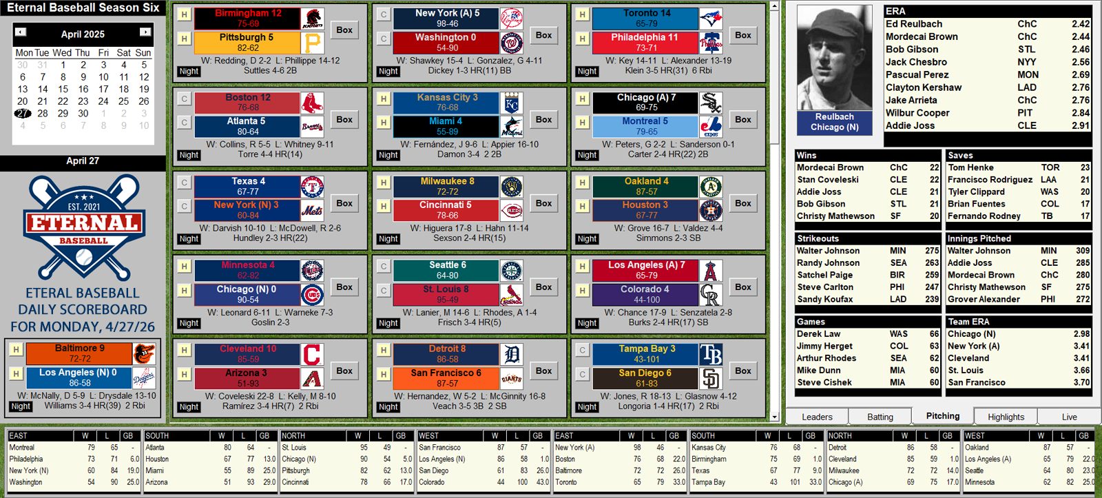 Sign up for our weekly Eternal Baseball Newsletter for updates on the standings, historic player performances and interesting statistical factoids from our current season. It’s interesting, informative and fun.